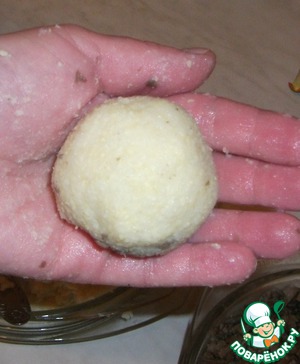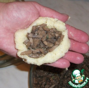 А теперь лепим наши крокеты. Руки смочить холодной водой, взять в ладонь немного пшённого теста, размять его в лепёшечку, положить грибную начинку и...