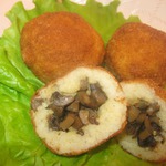 Последние 6 штук на пробу сделала так: смешала пшённое тесто с грибной начинкой и накатала шарики. Крокеты обмакнуть в слегка взбитые яйца, обвалять в панировочных сухарях и обжарить во фритюре из растительного масла. Этот шаг, к сожалению, забыла запечатлеть.