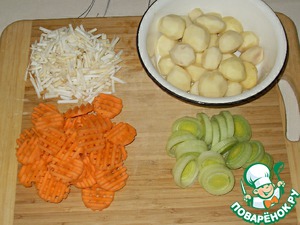 Картошечку очистить. Если картошка крупная, нарезать ее на кусочки. Морковь очистить и нарезать кружочками, порей - колечками, сельдерей - соломкой.