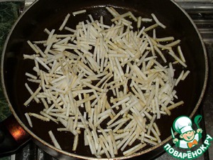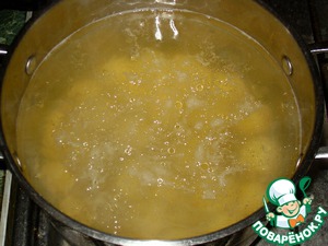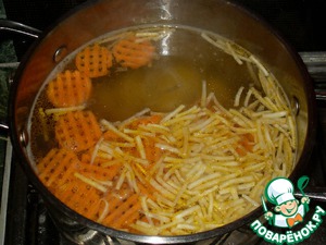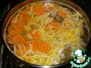 В кипящий бульон положить картошку, довести до кипения и варить 10 минут на маленьком огне.