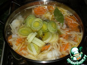 Затем добавить порей, перец горошком и лаврушку и варить до готовности, примерно минут 5.