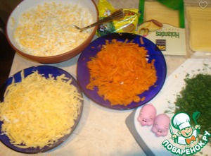 • Морковь, яйца, чеснок (выдавить), сыр натереть на тёрке. Укроп мелко нарезать. Соль-перец добавить по вкусу.