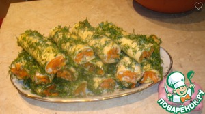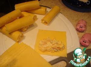• Берём сыра кусочек и накладываем начинку и заворачиваем, затем в концы засовываем морковку с одной и другой стороны.