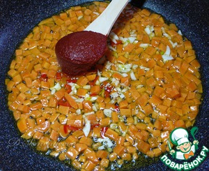 Обжарить овощи в той же сковороде, где жарились фрикадельки, до мягкости, около 7 мин. Добавить томатную пасту.