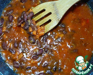Томатную пасту можно развести томатным соком, или кипяченой водой. Добавить фасоль, хорошо всё размешать и прогреть.