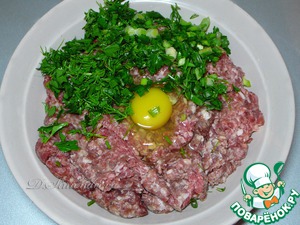 Для фрикаделек очень мелко нарезать зелень, смешать с фаршем, посолить, поперчить и тщательно перемешать.