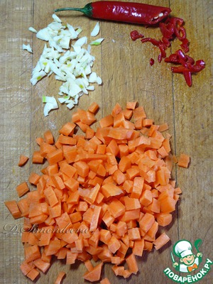 Очистить морковь и чеснок, нарезать очень маленькими кубиками. Нарезать мелко перец чили, количество и остроту выбирайте на свой вкус.