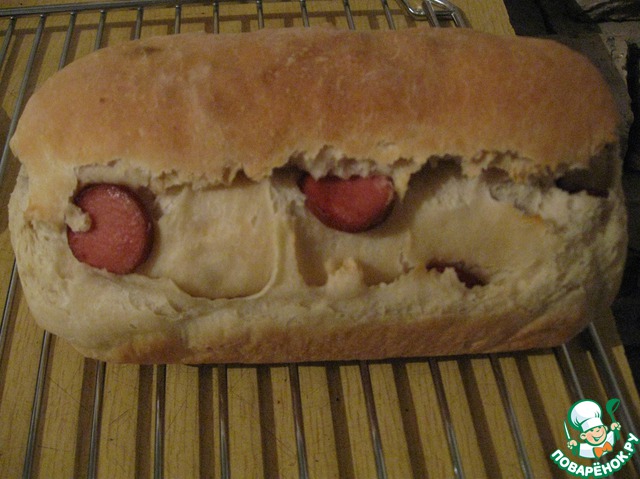 Выпекать при 180-200 градусов 40-60 мин в прямоугольной форме. У меня всегда раскрывается, но так интересней коробочка из хлеба для сосисок!