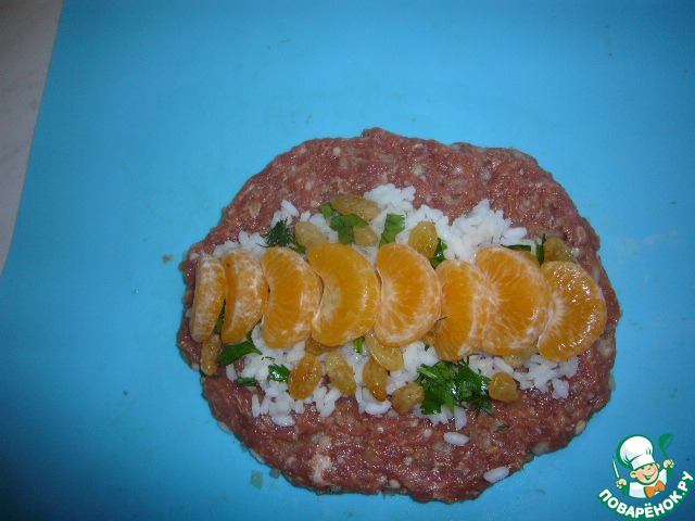 • Разделить мясную массу на 4 части (две части - большего размера и две части размером в два раза меньше), двум частям придать форму лепешки, на середину уложить рис, немного рубленой зелени, изюм и ломтики мандаринов. Насколько позволит начинка, завернуть края лепешки, формуя рулеты. Сверху наложить меньшие части мясной массы и закончить формовку рулетов.