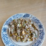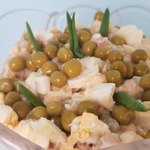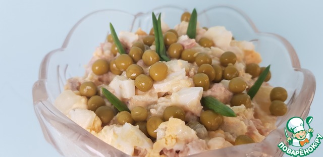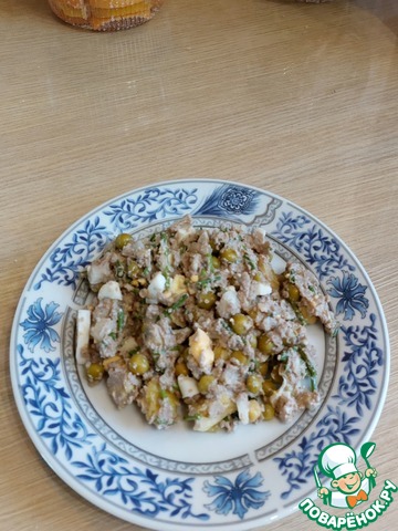3. Смешать все это с зеленым горошком, нашинкованным репчатым и зеленым луком, посолить по вкусу.