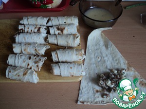 Лаваш разрезаем на треугольники. Узкий конец с одной стороны смазываем оставшейся частью взбитого яйца, укладываем начинку и заворачиваем.