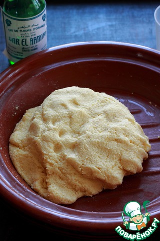 Час прошел, манка немного разбухла, добавляем апельсиново-цветочную воду (или другую ароматизированную) и вмешиваем ее, собирая тесто в комок. Он будет очень-очень мягким. Снова накрываем тесто крышкой и забываем о нем на час.