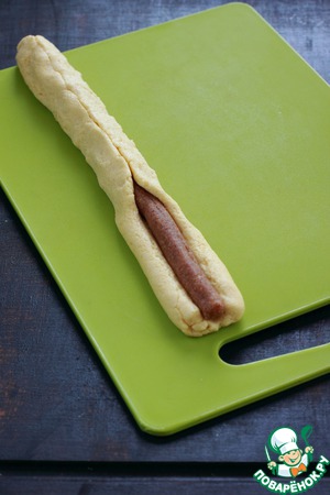 Из теста скатайте колбаску, пальцем сделайте неглубокую бороздку. Из миндальной пасты тоже скатайте заготовку, равную по длине заготовке из манного теста.