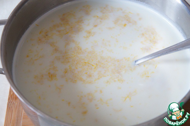 В сотейник влить молоко, добавить сахар, мед, соль и цедру, подогреть.