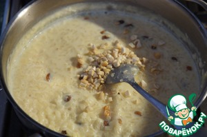 В готовую кашу добавить изюм, орехи и кокосовую стружку, хорошо перемешать.