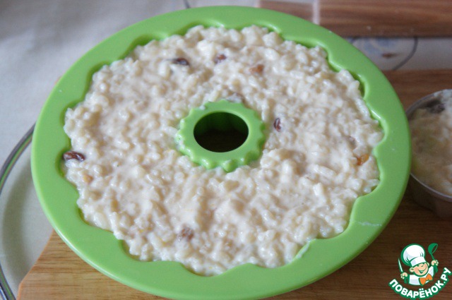 В подготовленную форму выложить рис и хорошо уплотнить. Накрыть форму пленкой и дать остыть до комнатной температуры. Можно ненадолго вынести форму на холод.