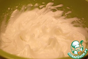 • Белки взбить со щепоткой соли, добавляя постепенно оставшийся сахар (50гр).
