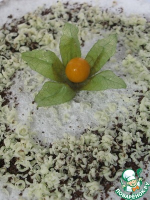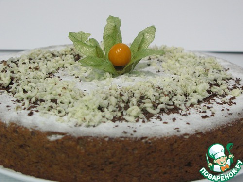 12. Посыпаем пирог сахарной пудрой и натертым на мелкой терке шоколадом, украшаем физалисом. Приятного аппетита!
