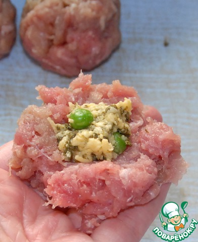 100г сыра натираем на мелкой терке, щавель размораживаем отжимаем и перемешиваем с сыром, добавляем горсть зеленого горошка и перемешиваем еще раз. Из фарша делаем лепешку кладем немного сырной массы в середину и формируем шарик с начинкой внутри. (не стоит делать шарики слишком большими оптимальный размер с грецкий орех)