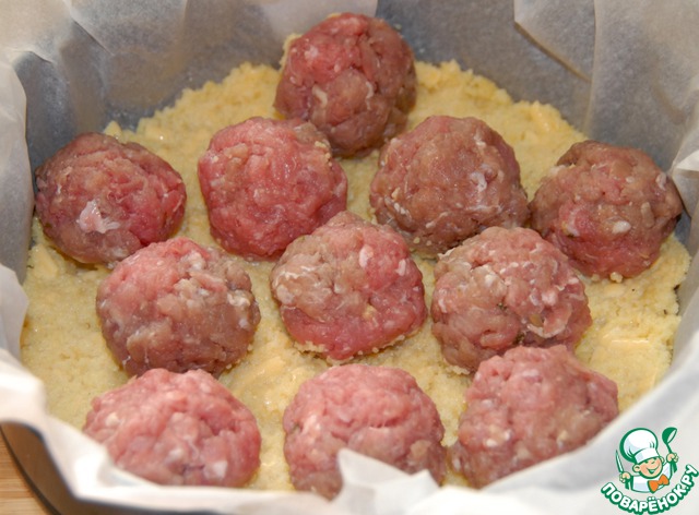 Форму (у меня 24см) выстилаем бумагой для выпечки. Так удобнее потом внимать наш пирог. Выкладываем 1/3 смеси с кус-кусом. Сверху раскладываем шарики.