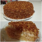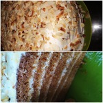 В первый раз мед с содой подмешивала к яйцам с помощью лопатки, а потом и муку лопаткой...в итоге карамельно-мучная смесь осела на дне миски( Бисквит получился твердоват. Но скремом и орехами зашел отлично. Орехи измельчала скалкой.