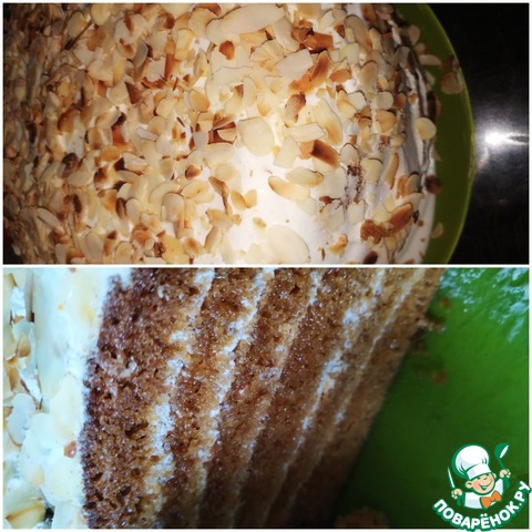 Смазываем коржи сметанным кремом, верх торта смазываем масляным кремом и посыпаем измельченными в блендере грецкими орешками.