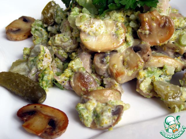 В чашку выложить грибы, огурцы, брокколи, разобранные на соцветия.