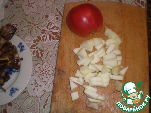 К луку добавляем мелко нарезанное яблоко. Обжариваем до мягкости.