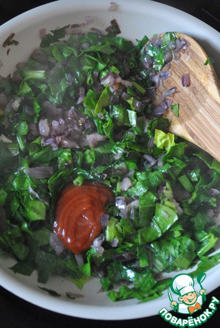 Добавляем шпинат и ложку томатной пасты. Перемешиваем.