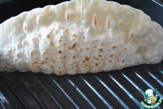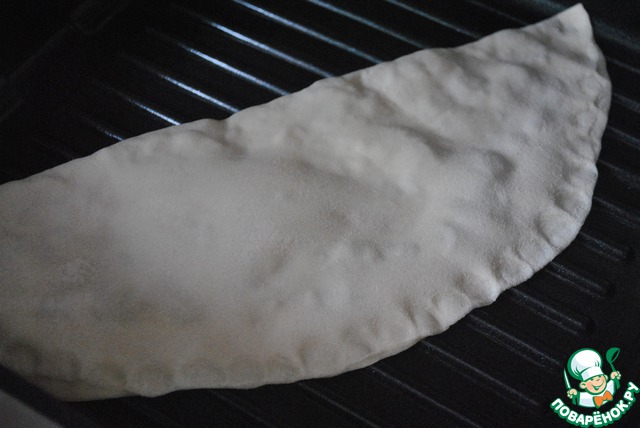Обжариваем на сухой, раскаленной сковородке, без масла. С двух сторон. Я обычно жарю на тефлоновой сковородке, сегодня просто захотелось чебурек с полосками:)