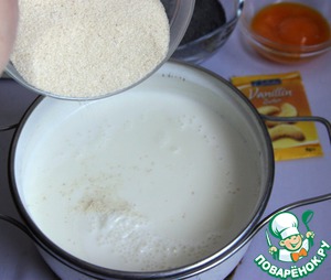 Добавить в горячее молоко 125 г манки.