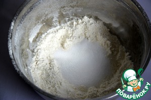 В просеянную муку раскрошить дрожжи и немного перетереть их с мукой.