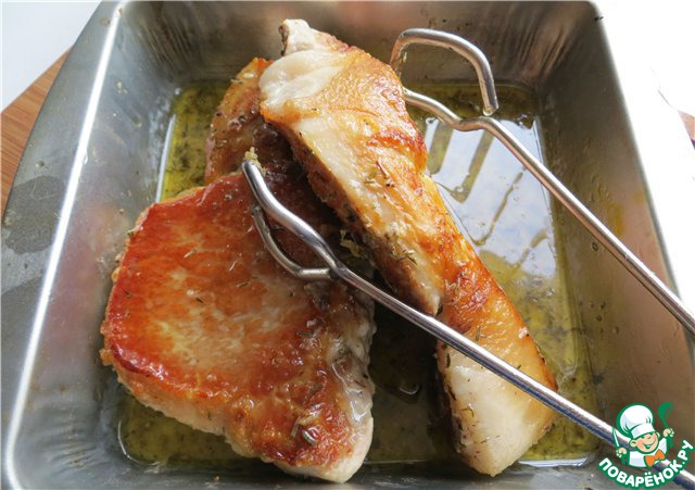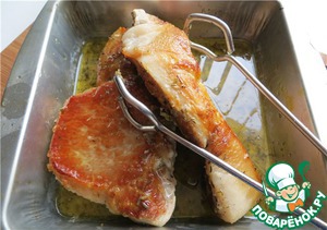 • После того, как мясо пожарилось, кладем эти стейки в форму, предварительно добавив туда соус. И сверху еще польем. Пускай полежат. Мясу надо дать время отдохнуть.