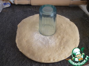 Готовое тесто делим на две половины. Подсыпая много муки, обваливаем одну половину теста в муке и раскатываем или растягиваем руками. Ложим в смазанную маслом форму (желательно разъемную). Выкладываем начинку. Сверху вторую часть теста. Ставим стакан так, чтоб остался след и убираем борта.