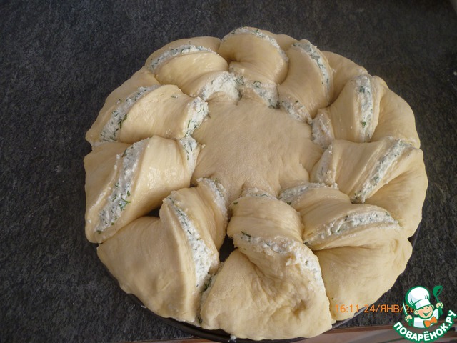 В теплом молоке развести дрожжи, смешать с половиной муки и поставить в тепло на 30 мин. Затем добавить остальные ингредиенты (муку сыпать по чуть-чуть, т. к. ее кол-во может меняться) и хорошо перемешать ложкой. Если не получается ложкой, значит муки уже много, это не критично, но пирог потеряет немного нежности, продолжайте месить руками. И убираем в тепло, пока не поднимется (прим. на 30 мин.). В это время готовим начинку. Творог яйцо и зелень смешать, посолить.