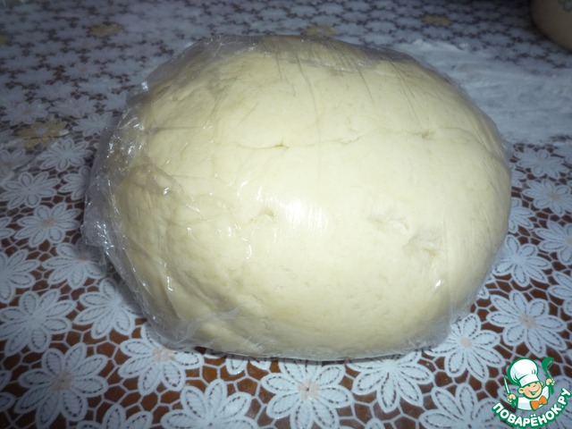 Через час разделить тесто на 5 равных частей. Раскатать каждую по размеру противеня.