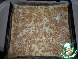 Противень смазать маслом и застелить пекарской бумагой. У меня был стандартный противень, который идёт в комплекте с газовой плитой. Аккуратно положить на бумагу первый пласт теста. Посыпать сверху тёртым щербетом и сахаром (1 ст. л). Так чередовать каждый слой: тесто-начинка-тесто.