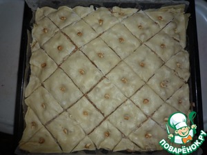 Когда все слои будут готовы, нужно разрезать пирог на ромбики. В центр каждого ромбика вдавить орешек, можно арахис или грецкий орех. Смазать верх желтком. Поставить пахлаву в разогретую до 180 градусов духовку до готовности. Я пеку при 200 градусах примерно 40-50 мин. Время зависит от вашей духовки, но я ориентируюсь на цвет пахлавы.