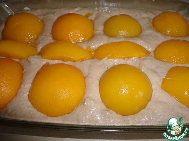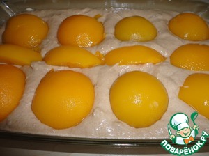 Форму смазать слив. маслом. Выложить манную смесь и разровнять. Сверху выложить персики. Отправляем в духовку на 35 мин.