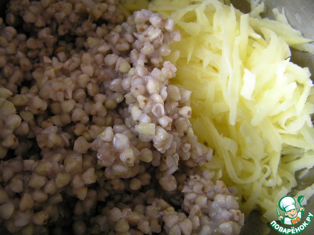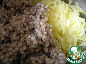 Очистить картофель и натереть на крупной терке, слегка отжать от лишней влаги, добавить гречку, перемешать.
