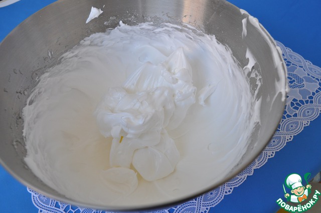 Белки взбить с оставшимся сахаром до устойчивых пиков.