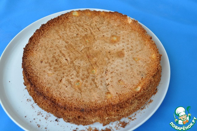 Готовый бисквит остудить, вынуть из формы, разрезать на 4 сектора.