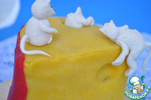 Обрезала все лишнее. Раскатала боковую полоску и присоединила её к торту. Пестиком от ступки сделала "дырки" на "сыре".