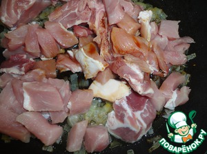 Теперь выкладываем обжаренное мясо с луком.
