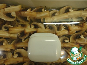 Сверху!!! на мясо выкладываем порезанные на 4 части шампиньоны. Когда грибы лежат сверху, они не поломаются!! В дальнейшем нам они пригодятся для украшения блюда. Заливаем теплой водой из расчёта риса (1:2,5).