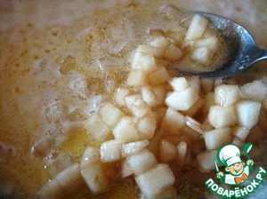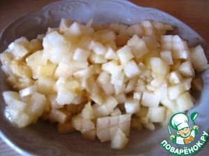 Теперь отставим тесто в сторону и займемся грушами. Очистить, удалить сердцевину и порезать мелкими кубиками. Сразу отложим 1/3 часть нарезанных груш. Они понадобятся для соуса.