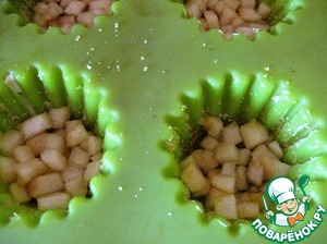 На дно подготовленной формы выложить 2/3 нарезанной груши. Во все формочки равное количество.