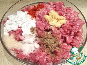 Свиную шею, лопатку и сало смолоть на мясорубке с мелким решетом. Добавить соль, сахар, молотый перец, паприку, кориандр, мускатный орех, рисовый крахмал, чеснок. Влить воду.