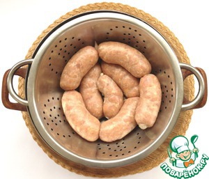 Если пароварки нет, положите колбаски в дуршлаг, поставьте на емкость с водой большую по размеру и готовьте тоже минут 40. (Вода ни в коем случае не должна кипеть!) Если у вас есть кухонный термометр - готовность проверить еще проще. Температура внутри изделия должна быть 75*