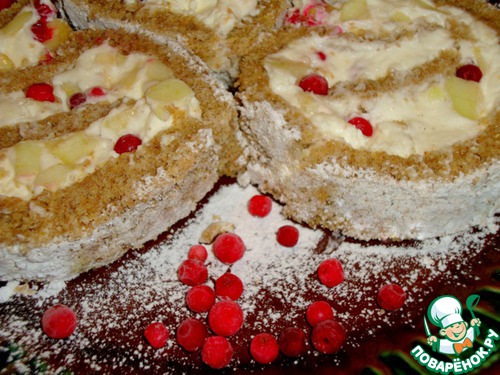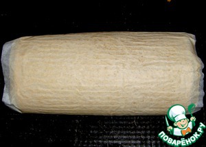 Пусть немного так постоит, чтобы корж пропитался соком начинки. После чего аккуратно сворачиваем рулет с пергаментом. Пергамент легко отделяется от коржа.